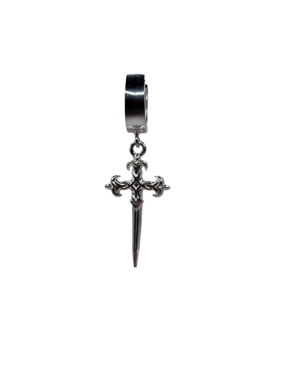 The earring features a comfortable, secure huggie hoop closure that is easy to wear and stays firmly in place. Suspended from the hoop is a stunning, elongated charm. The charm combines the traditional Gothic Cross motif with a sharp dagger or sword element, creating a powerful, edgy aesthetic. The ornate detailing (resembling the fleur-de-lis) at the top of the dagger adds a luxurious, vintage feel.